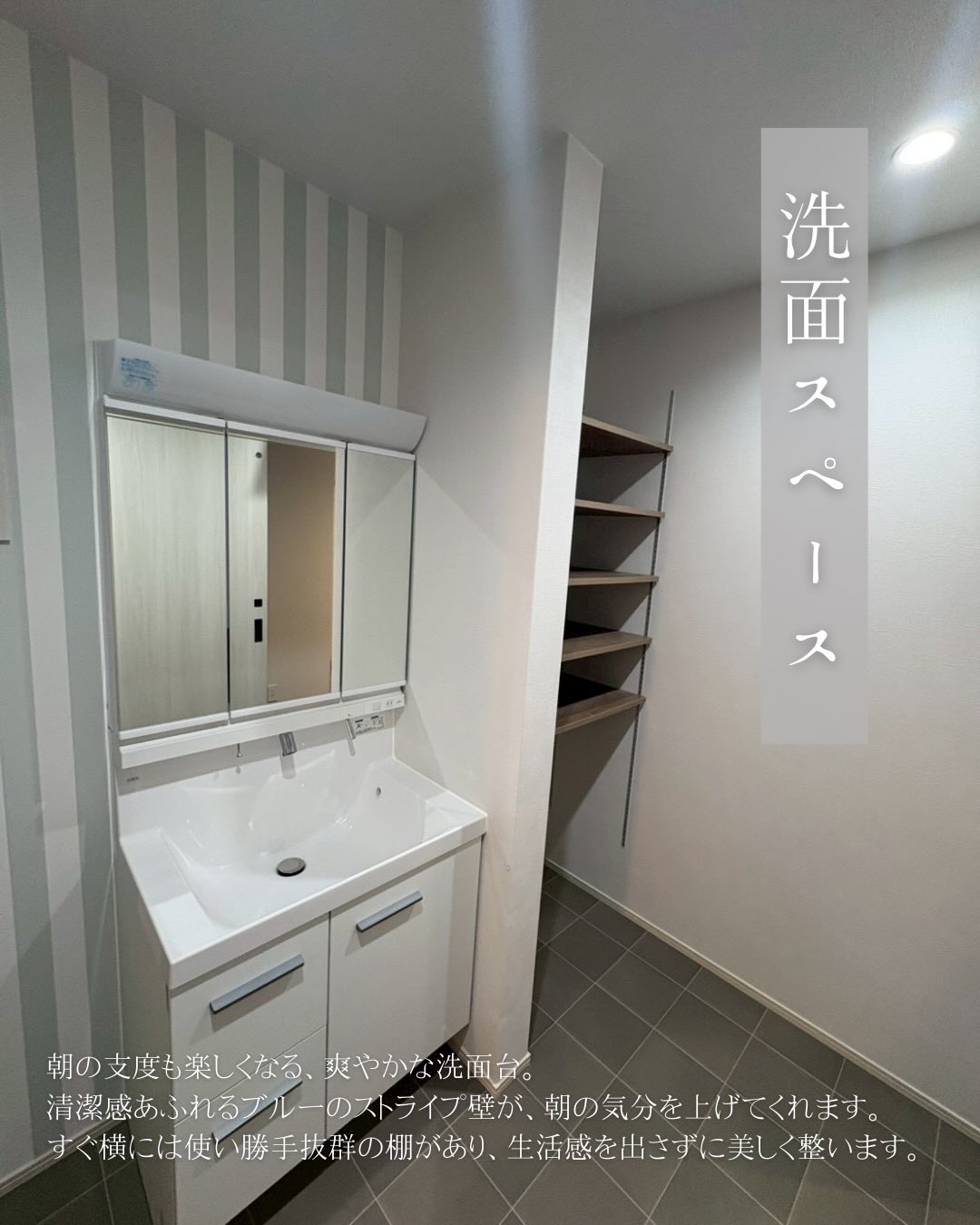爽やかなブルーストライプの壁紙がポイント!隣には大容量の棚もあり、生活感を隠してスッキリ整います。